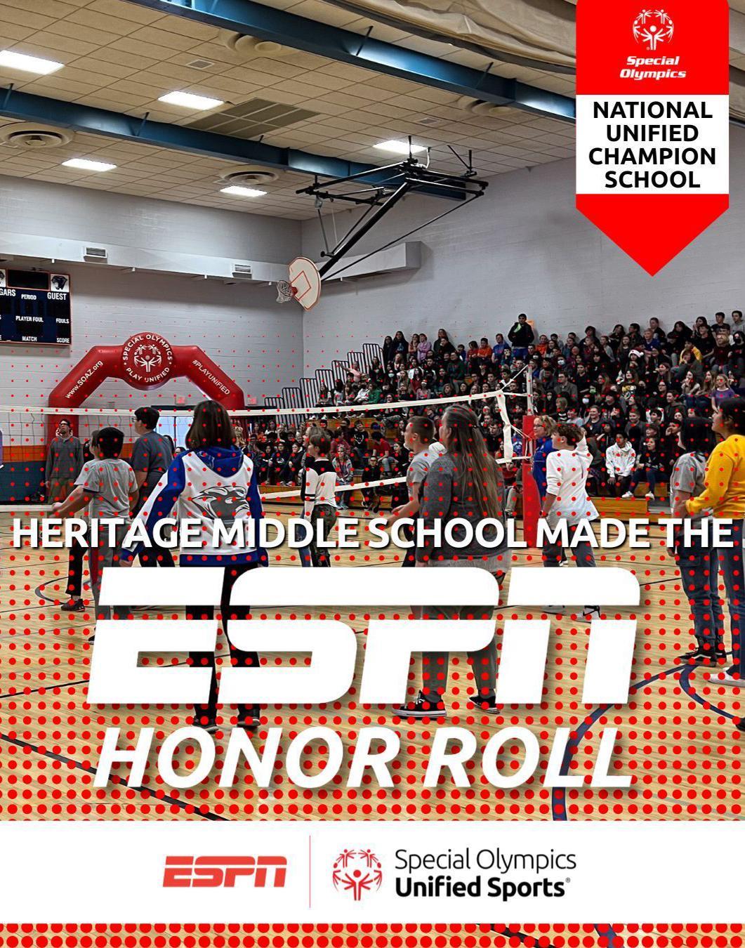 Congratulations to Heritage Middle School for officially earning a spot on the ESPN Honor Roll of National Unified Champion Schools! We are so proud of our students and staff!
